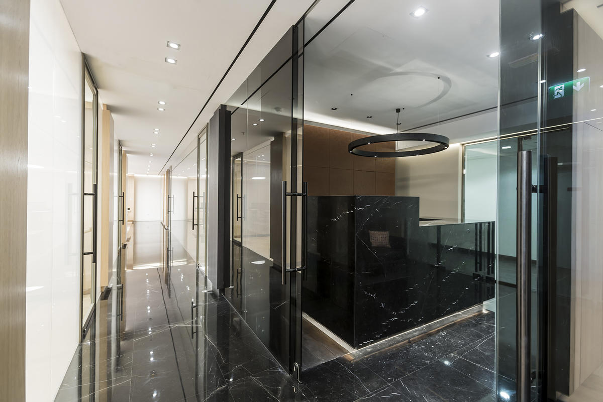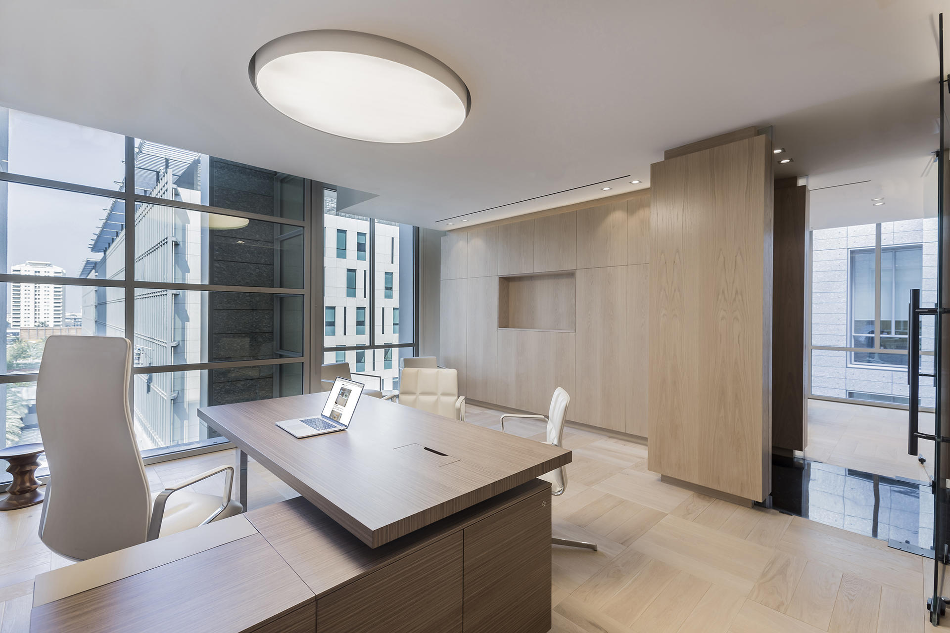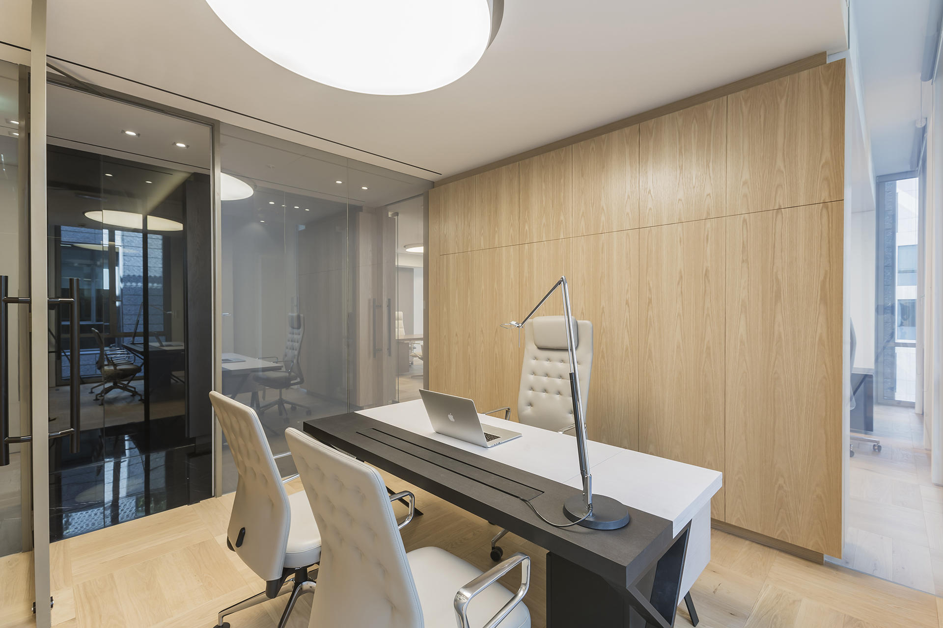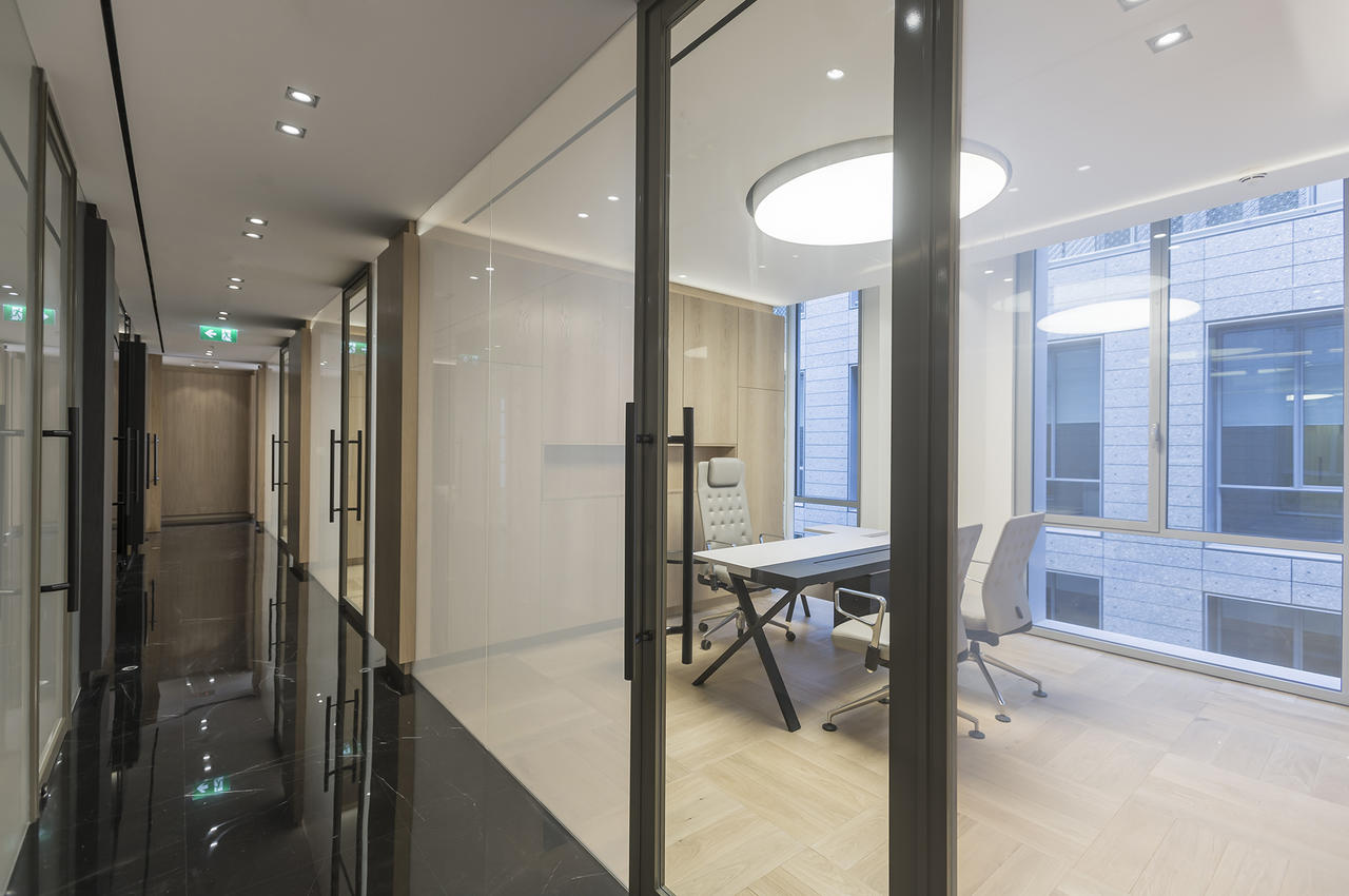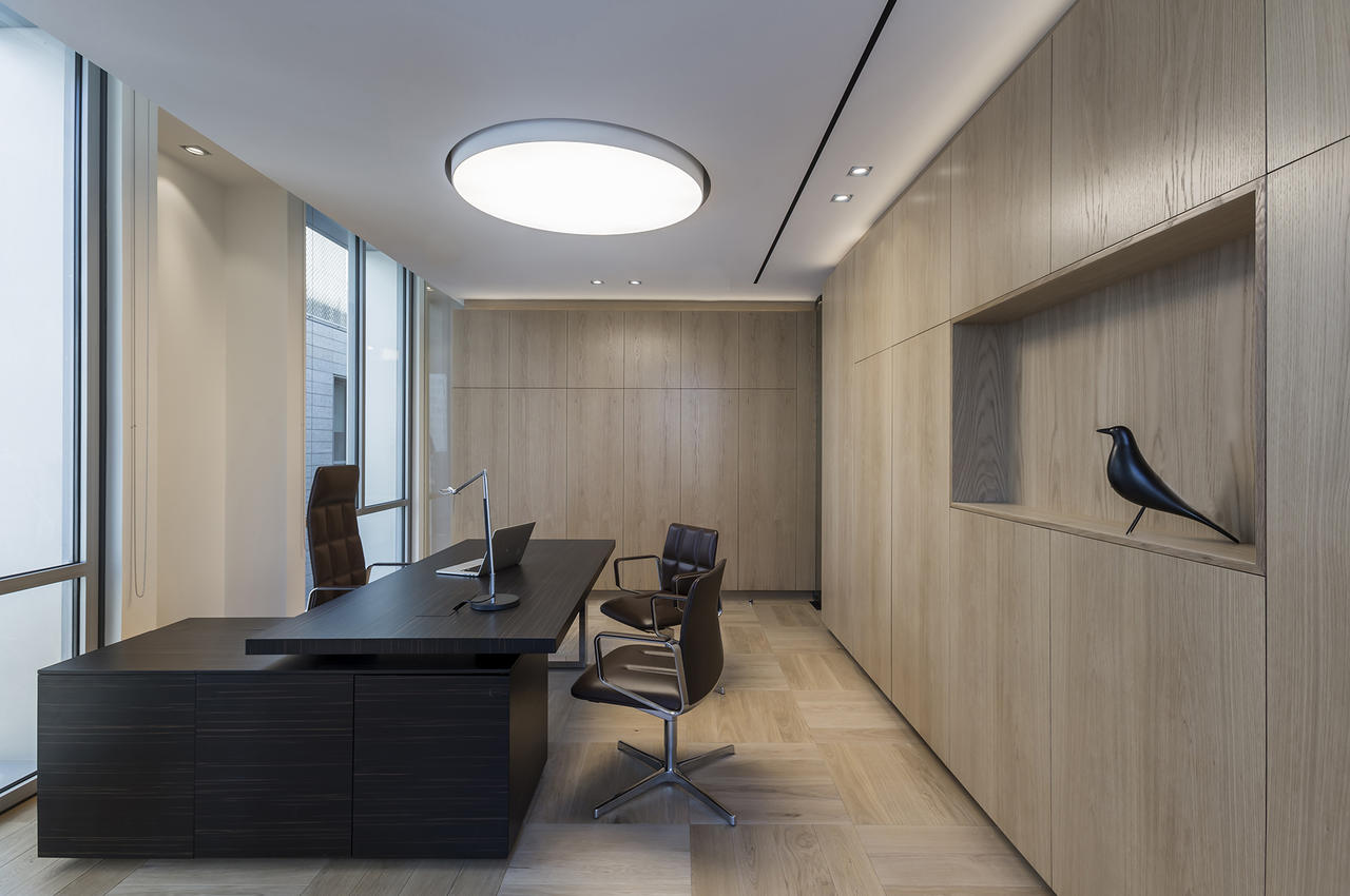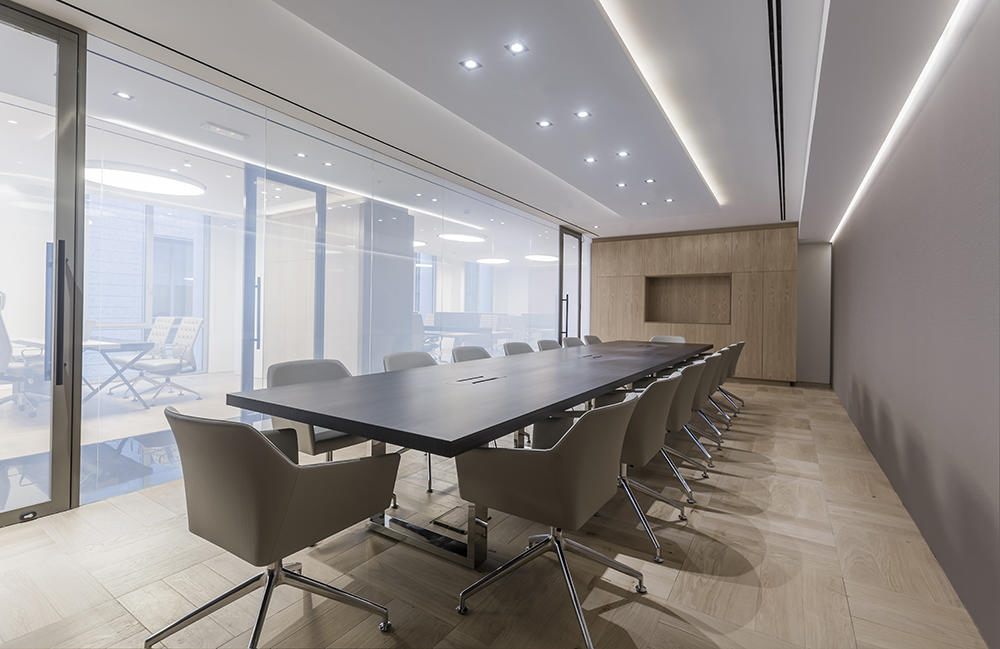 Tavoli, scrivanie e cabinet sono stati personalizzati secondo i dettami del cliente che ha richiesto materiali e finiture ricercati come legni di rovere e di noce con particolari spazzolature e glossaggi, vernici nere opache e acciai extra lucidi. Questi contrasti, esaltati da un livello qualitativo impeccabile, hanno conferito agli spazi un’allure sobria e molto elegante, sempre nel rispetto delle normative locali in materia di salute e sicurezza sul lavoro.