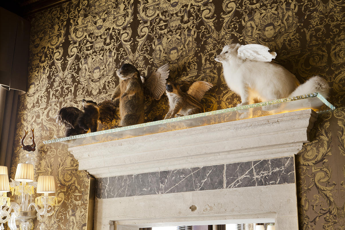 Il Grancaffè Quadri si trova in una delle zone più basse di Venezia e l’acqua, che invade la Piazza e inonda il locale quando il mare trabocca, ritirandosi lascia il segno del suo passaggio sui muri e sul mobilio. Invece che combattere l’inevitabile il Maestro Philip Starck ha dato valore ad esso e ha creato arredi metallici che, per effetto dell’ossidazione dovuta alla marea, cambiano colore e fanno sentire le vibrazioni della città.
