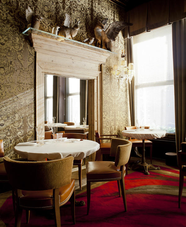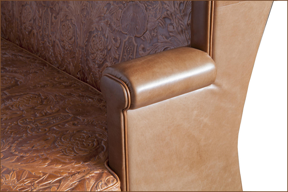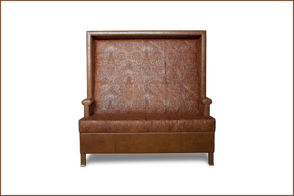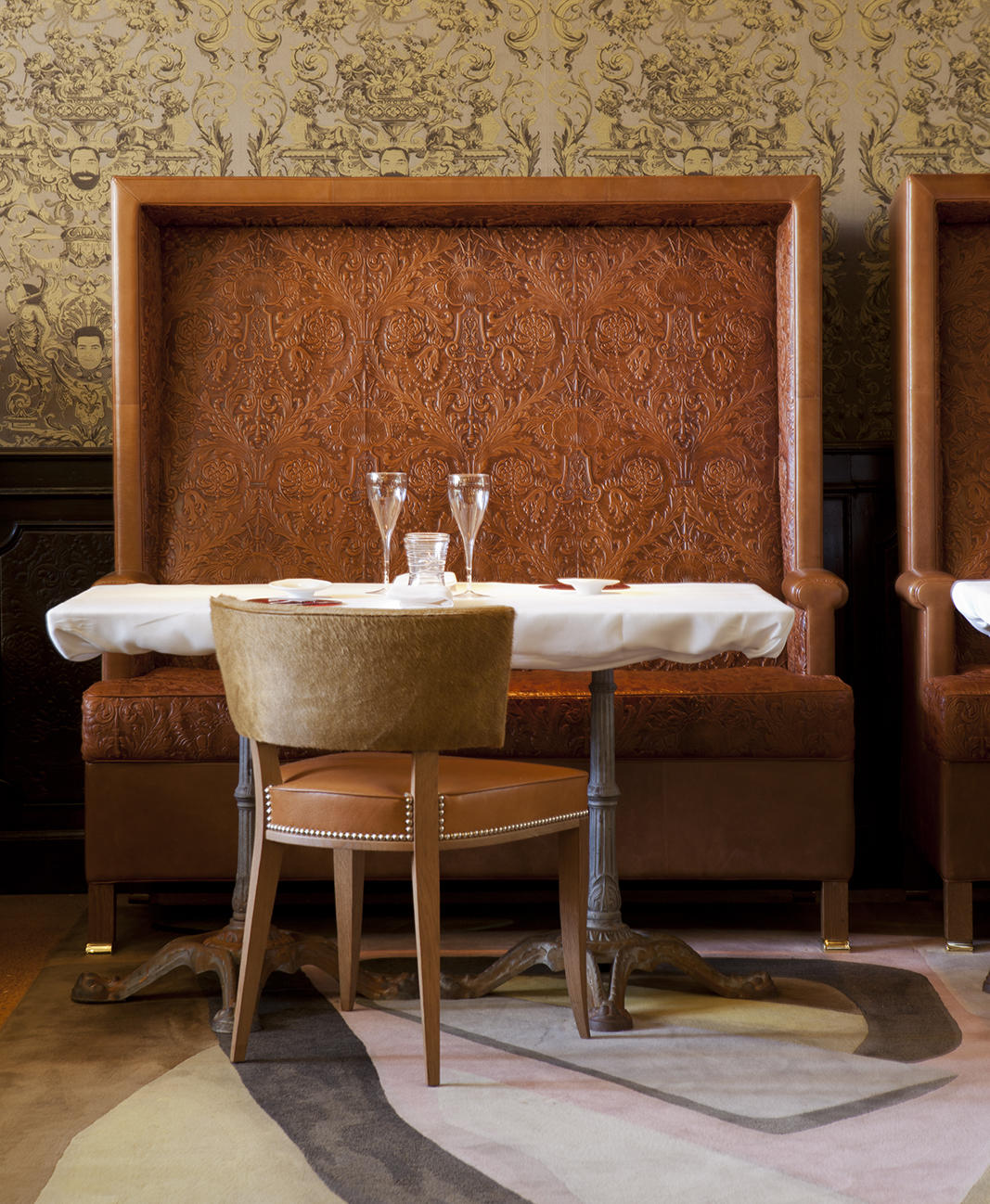 Interna è stata chiamata in causa nel ristorante situato al piano superiore e non intaccato dall’acqua, per il quale ha realizzato su disegno esclusivo delle imponenti sedute, quasi dei troni in preziosa pelle stampata a rilievo, un lavoro unico eseguito secondo standard qualitativi elevatissimi.