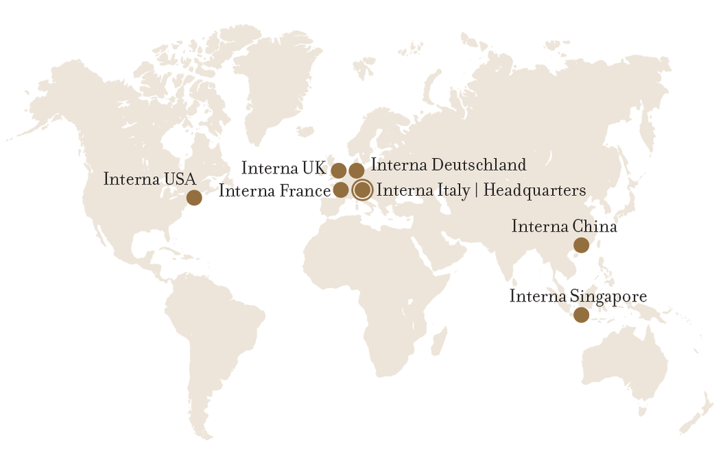 Il Gruppo Interna oggi opera a livello internazionale attraverso 7 unità locali indipendenti per offrire ai propri clienti ovunque nel mondo un uguale supporto: viene data assistenza agli interior designer nominati dalla committenza nel processo di preparazione delle specifiche degli articoli da crearsi in esclusiva ; viene garantita una continua e costante interazione con il team di lavoro del cliente, al fine di selezionare i prodotti più adatti al progetto nel rispetto di budget, tempi e qualità concordati. Le unità locali offrono in tutto il mondo lo stesso modus operandi, lo stesso livello di servizio e gli stessi articoli di assoluta qualità. Sono inoltre punto di riferimento commerciale dei brand di prodotto del Gruppo Interna, Interna Collection e Logica Office.
