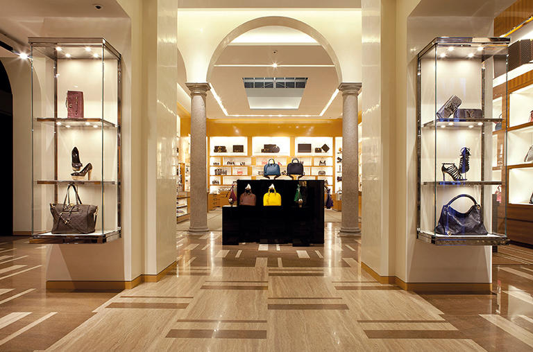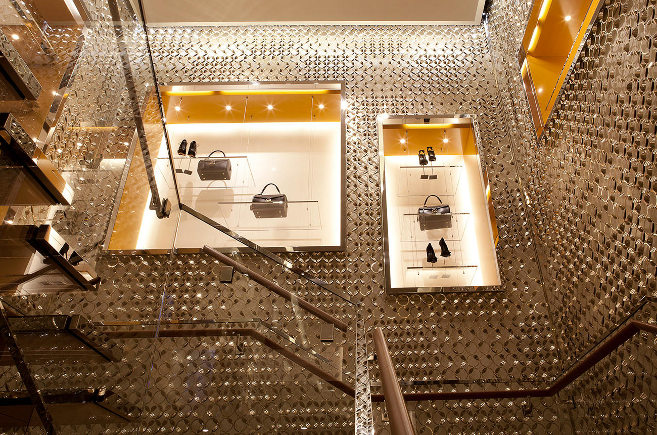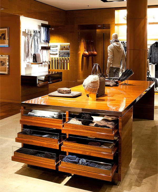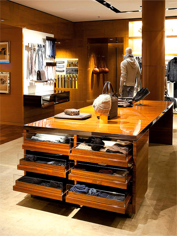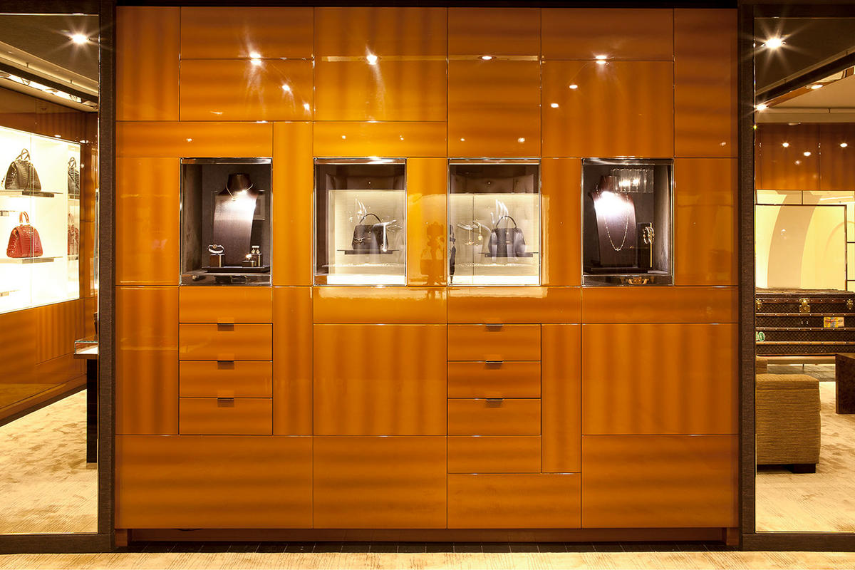 Il concept disegnato da Peter Marino per le boutique Louis Vuitton prevedeva spazi interpretati in chiave museale, di modo che ad ogni prodotto esposto venisse conferito un ruolo da protagonista incontrastato, rimirabile come vera e propria opera d’arte che rapisce il visitatore-acquirente fino a coinvolgerlo in una forte esperienza sensoriale.