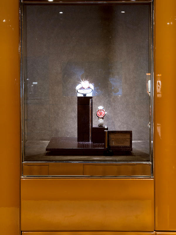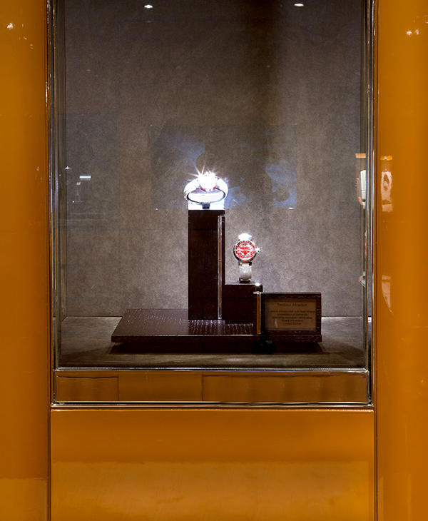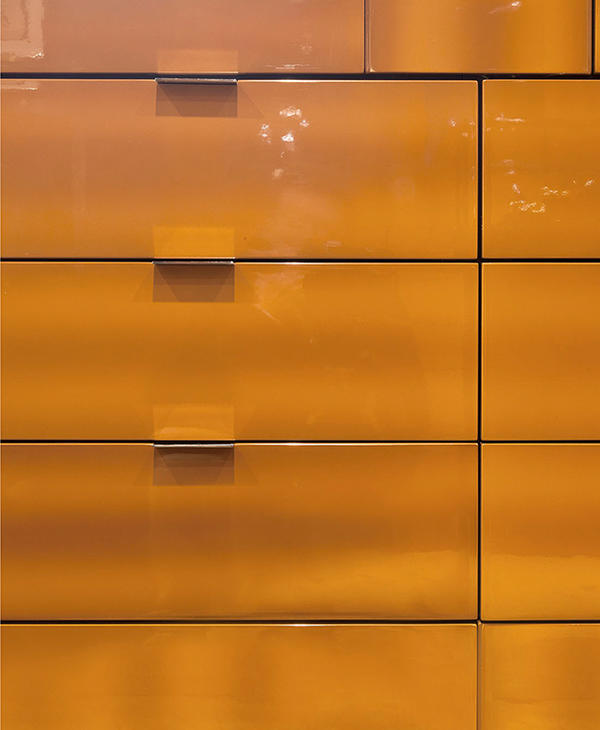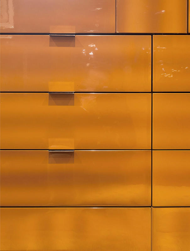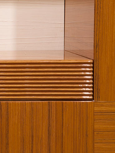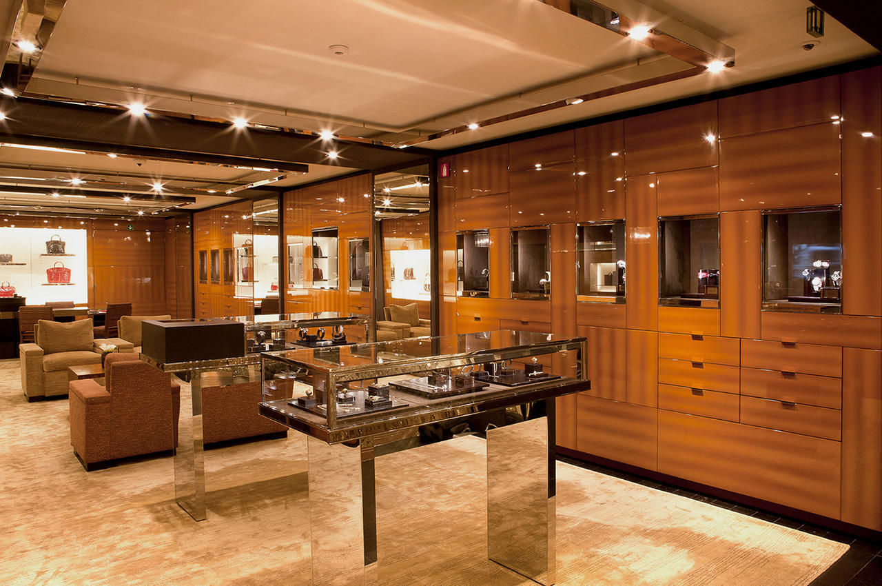 Caratteristica di questo sofisticato concept dall’esecuzione molto complessa era l’impiego di essenze di anigré dalle molteplici finiture, esaltate dal sapiente utilizzo dell’illuminazione e a cui si abbinavano lavorazioni di altri materiali di pregio: metalli, pelli, tessuti.