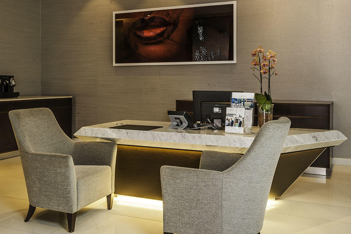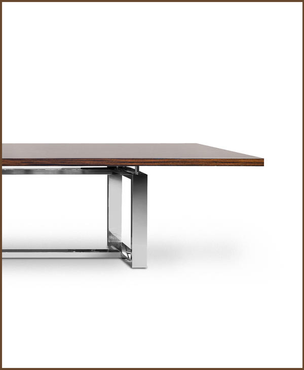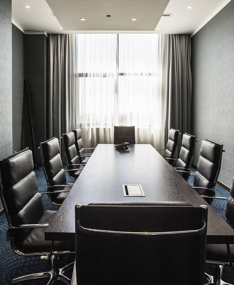 Anche le sale riunioni del front of the house sono state completamente arredate chiavi in mano da Interna con una predominanza di armadiature e tavoli eseguiti su disegno in essenze di pregio dai toni scuri e con sedute meeting in pelle e acciaio abbinate.