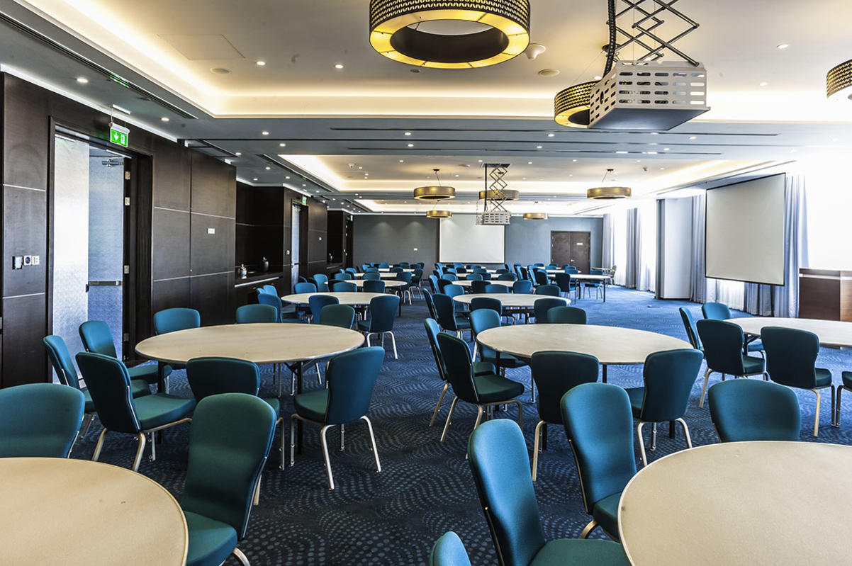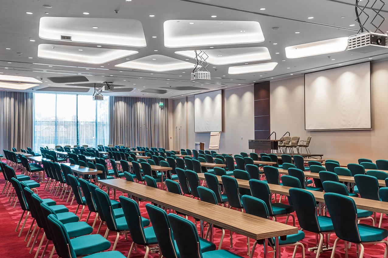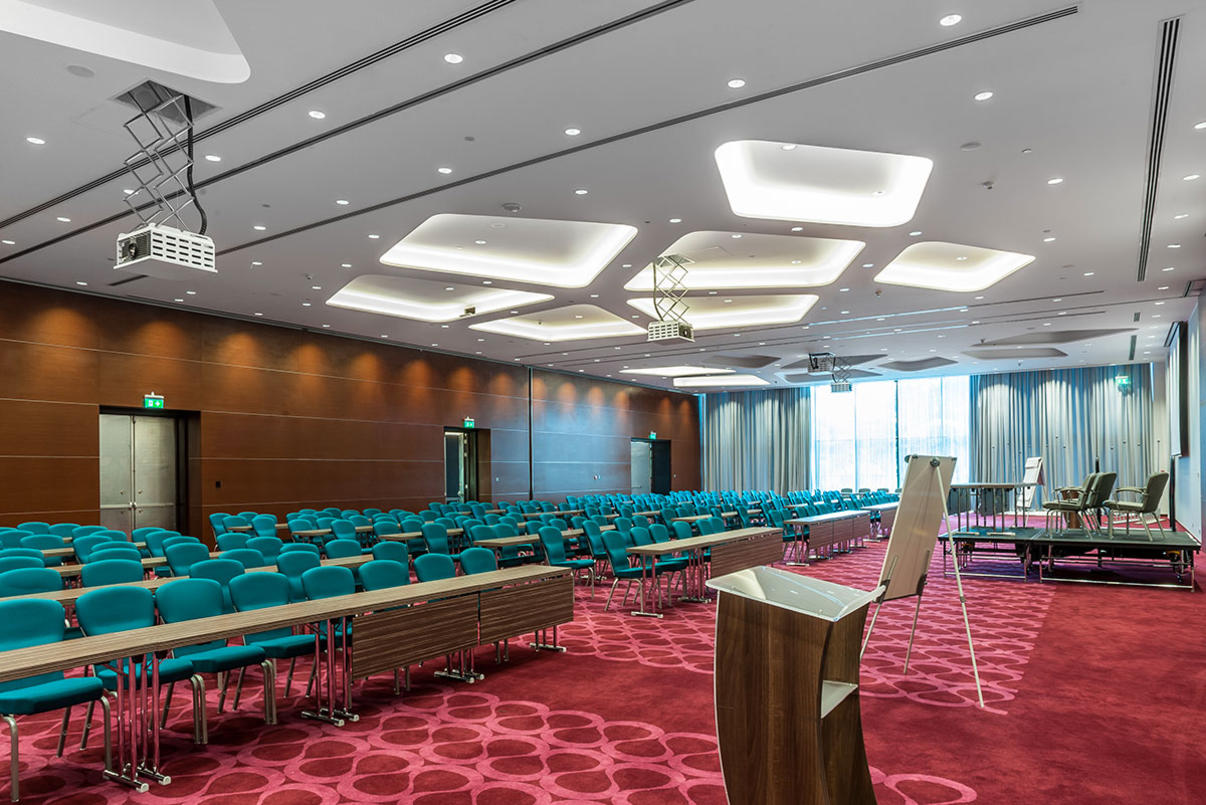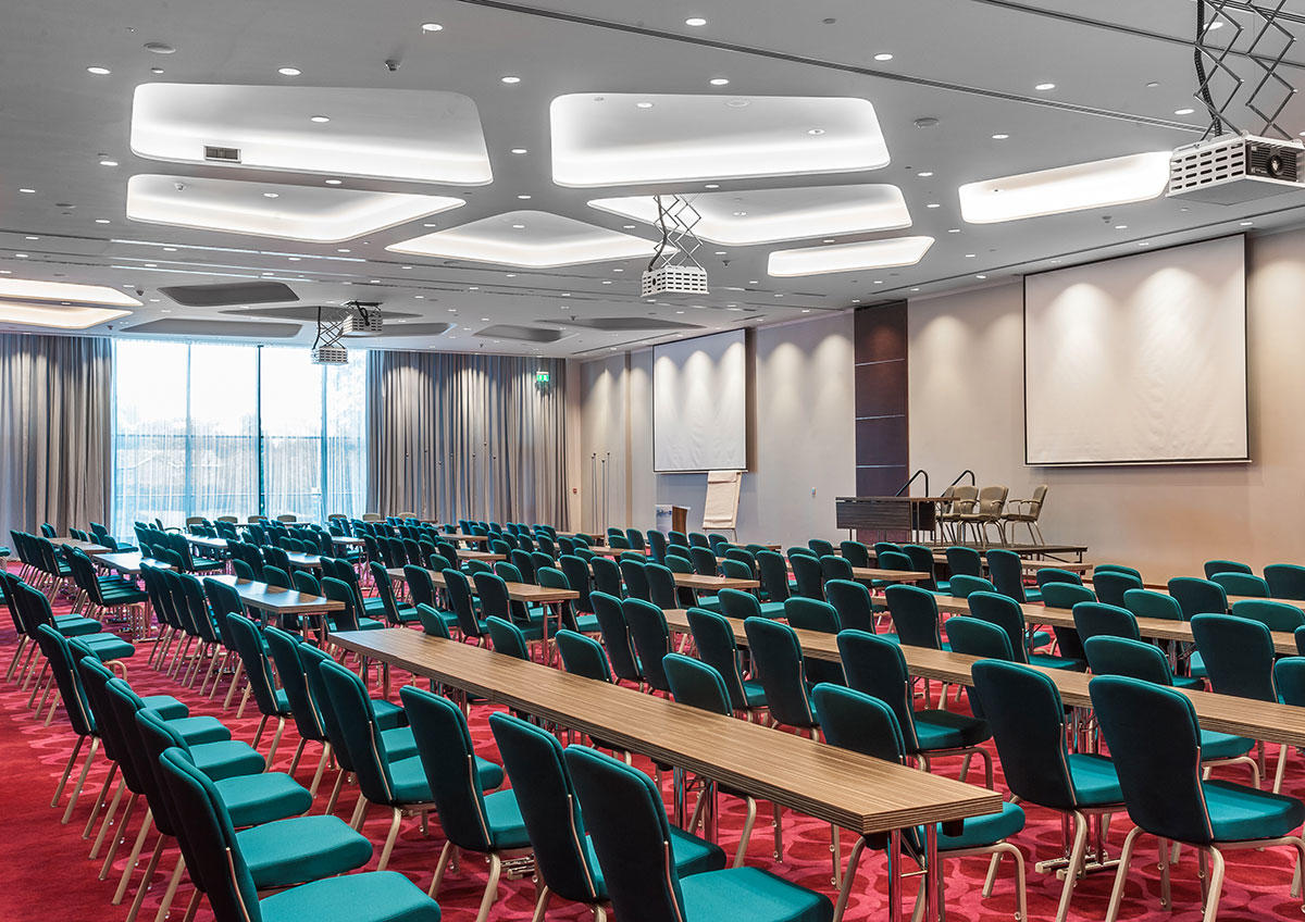 Per le sale seminari, banchetti e conferenze, oltre agli arredi fissi su misura, sono stati selezionati innumerevoli articoli delle collezioni hospitality di Interna: tavoli e sedie conferenza, tavoli seminario, tavoli buffet, pedane, podi, fioriere e un numero ragguardevole di altri prodotti di arredo funzionale in grado di soddisfare la logica industriale tipica della gestione e conduzione di una struttura collettiva.