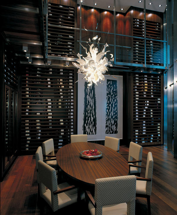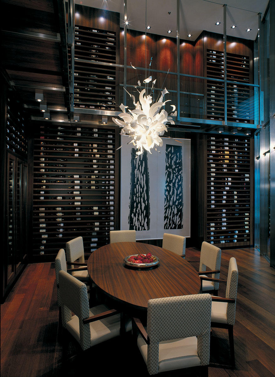 Gli arredi presentano linee semplici, raffinate ed eleganti, con un tema ricorrente che è l’alternanza tra arredi “caldi” in essenza di ciliegio e palissandro e complementi “freddi” in acciaio e vetro.