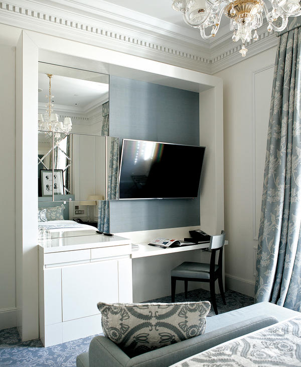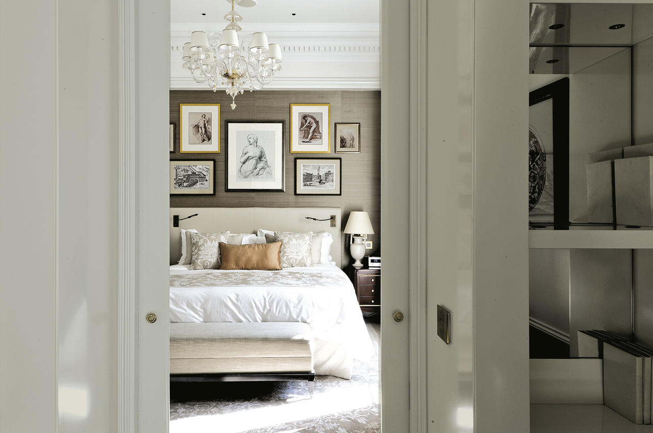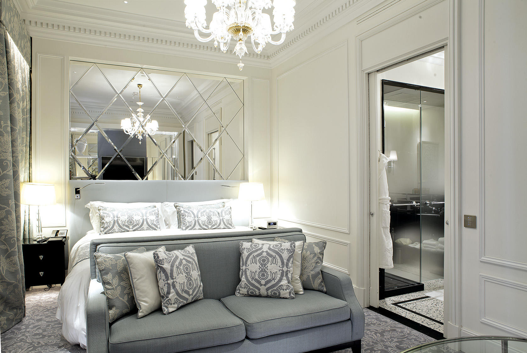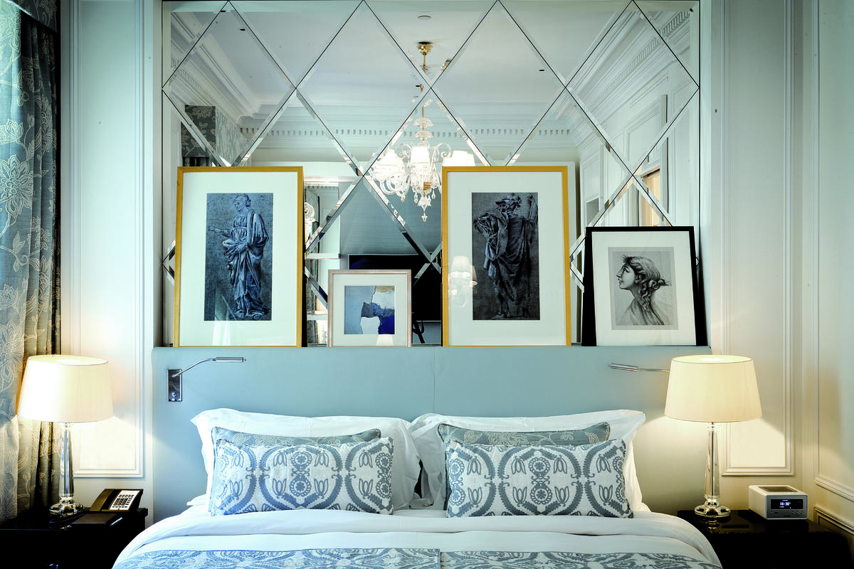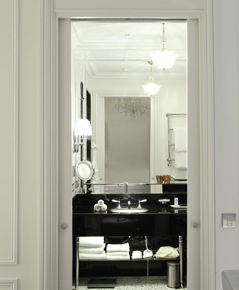 Le stanze da letto presentano un sapiente mix di stili - Impero, Regency e Luigi XV- ed evidenziano colori tenui nei toni dell’azzurro, del blu polvere e della terracotta, molto rilassanti; i bagni sono rivestiti in parte in marmo travertino, in parte in marmo nero Marquina con inserti in mosaico. Come le camere, anche le zone di passaggio e i corridoi ai piani hanno inserti decorativi in stile alle pareti.