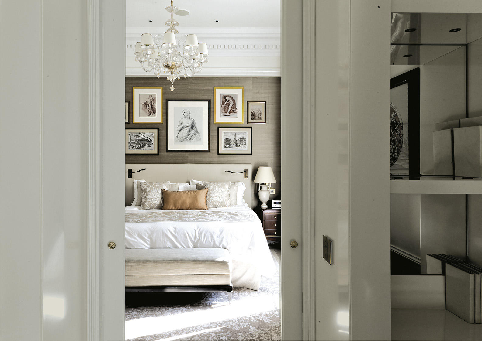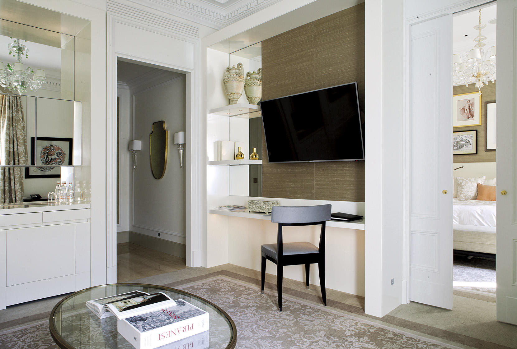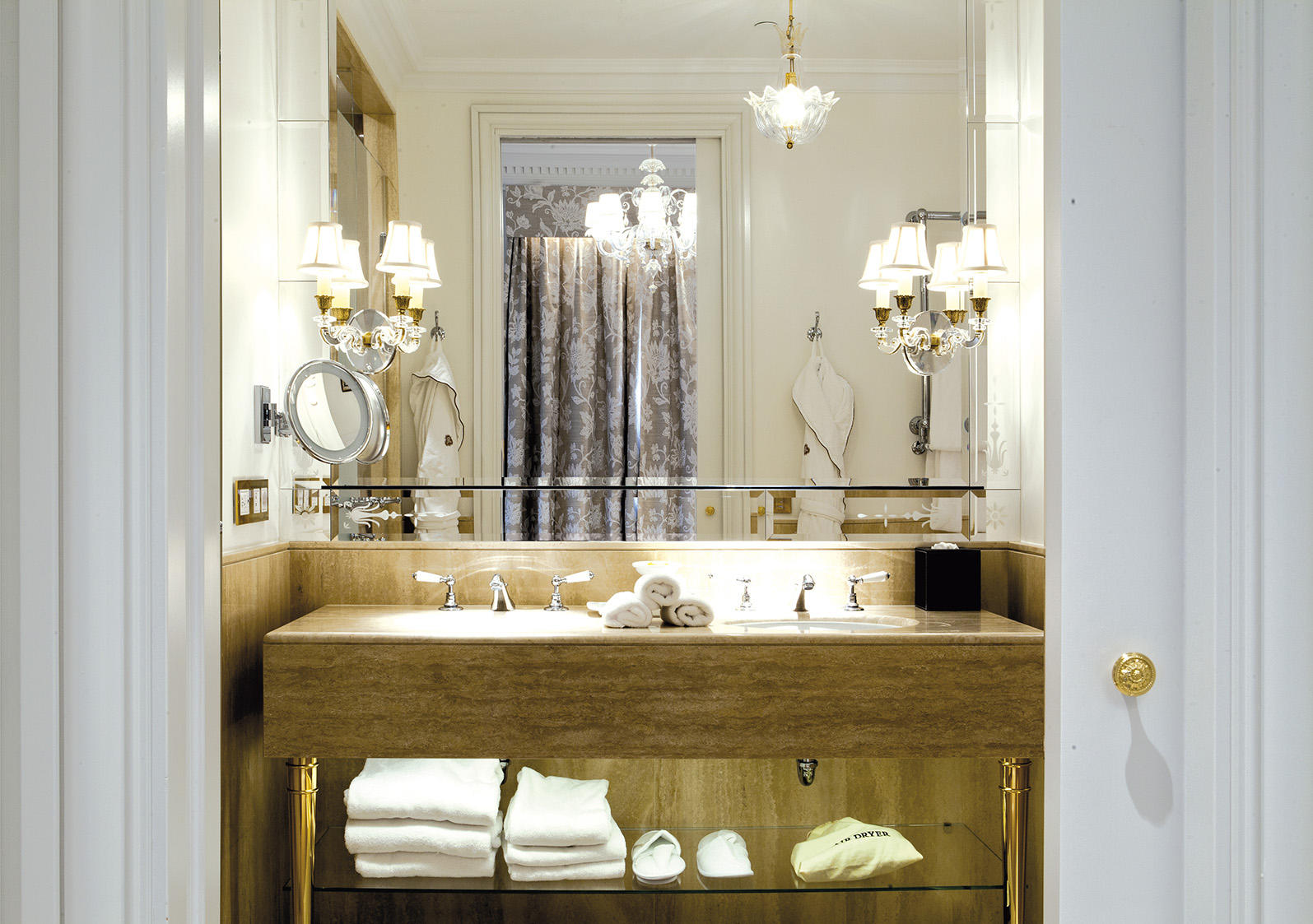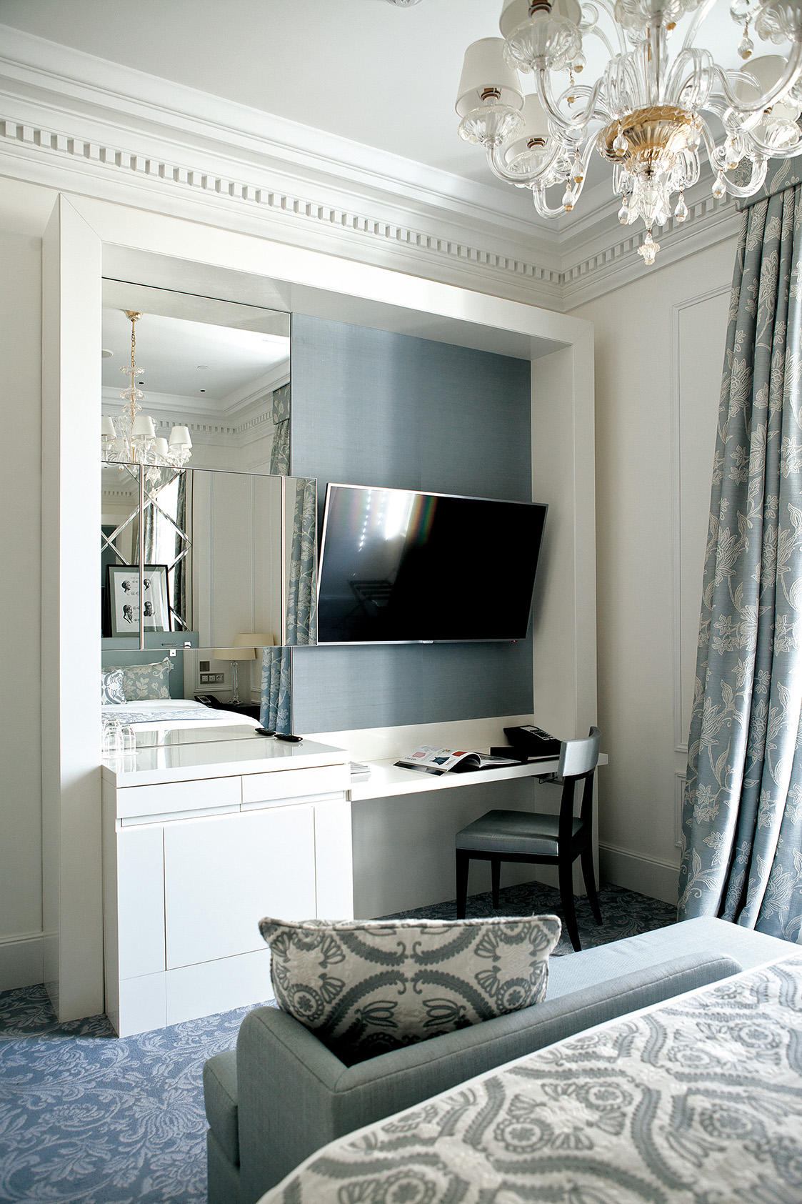 Le stanze da letto presentano un sapiente mix di stili - Impero, Regency e Luigi XV- ed evidenziano colori tenui nei toni dell’azzurro, del blu polvere e della terracotta, molto rilassanti; i bagni sono rivestiti in parte in marmo travertino, in parte in marmo nero Marquina con inserti in mosaico. Come le camere, anche le zone di passaggio e i corridoi ai piani hanno inserti decorativi in stile alle pareti.